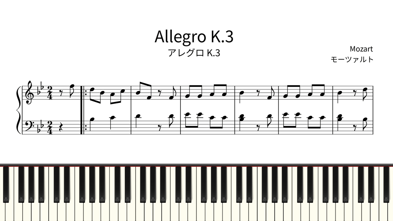 【簡単ピアノ楽譜】アレグロ K.3 モーツァルト / Allegro K.3 – Wolfgang Amadeus Mozart | Easy Piano Tutorial X Facebook はてブ LINE コピー 2026.01.18 【簡単ピアノ楽譜】 アレグロ K.3Allegro K.3ヴォルフガング・アマデウス・モーツァルトWolfgang Amadeus Mozart 🎼 楽譜(BOOTH) 音名なし楽譜 ドレミ付き楽譜 ABC付き楽譜 🎼 楽譜(Piascore) 音名なし楽譜 ドレミ付き楽譜 ABC付き楽譜 ▶️ 演奏動画:YouTube