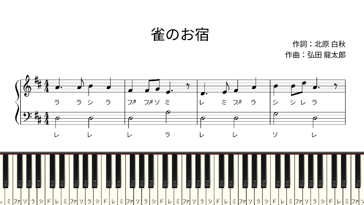 【ドレミ付き簡単ピアノ楽譜】雀のお宿 作詞:北原白秋 作曲:弘田龍太郎 / 笹薮 小薮 / ささやぶ こやぶ | 初心者向け